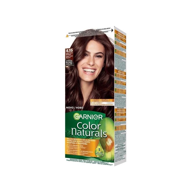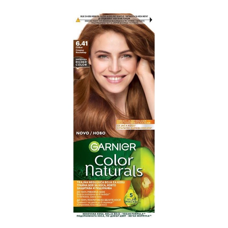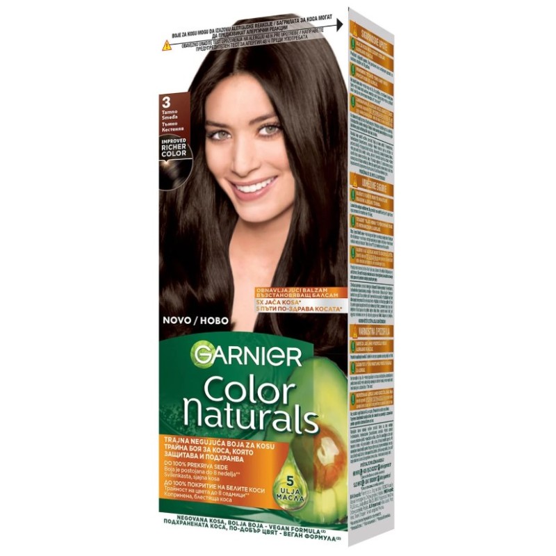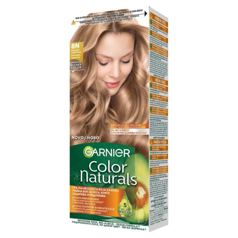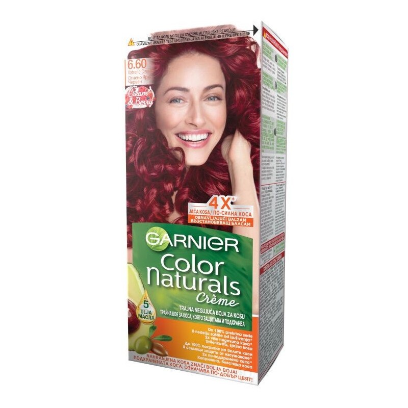 Garnier A Color Naturals egy tartós hajfesték dúsított formulával, amely hosszantartó színt, gazdag árnyalatokat és 100%-os fedést biztosít az ősz hajszálaknak. A hajápolás szem előtt tartásával kifejlesztett festék természetes olajok (olíva, avokádó és shea) hármas kombinációját tartalmazza, amelyek a festés során táplálják és hidratálják a hajat, puhává, selymessé és fényessé téve azt.
