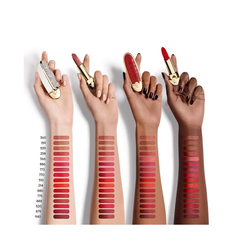 Különleges, tápláló olajokkal és hidratáló összetevőkkel gazdagított formulájának köszönhetően Guerlain Rouge G Velvet selymes érzetet és puhaságot biztosít. A rúzs kupak nélkül kapható, amely lehetővé teszi, hogy a Rouge G sorozat különféle, stílusos kupakjaival személyre szabható legyen.