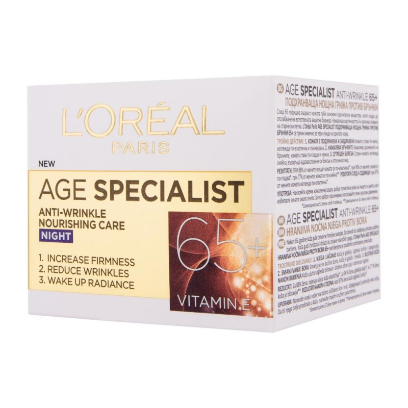 L'Oreal Paris Age Specialist Anti-Wrinkle 65+ egy helyreállító éjszakai krém, amelyet kifejezetten a 65+ éves érett bőr számára fejlesztettek ki, amely intenzív táplálásra, feszesítésre és a ráncok csökkentésére szorul. Az éjszakai pihenés alatt a bőr regenerálódik, és ennek a krémnek a formulája segíti ezt a folyamatot, simábbá, tömörebbé és rugalmasabbá téve azt.