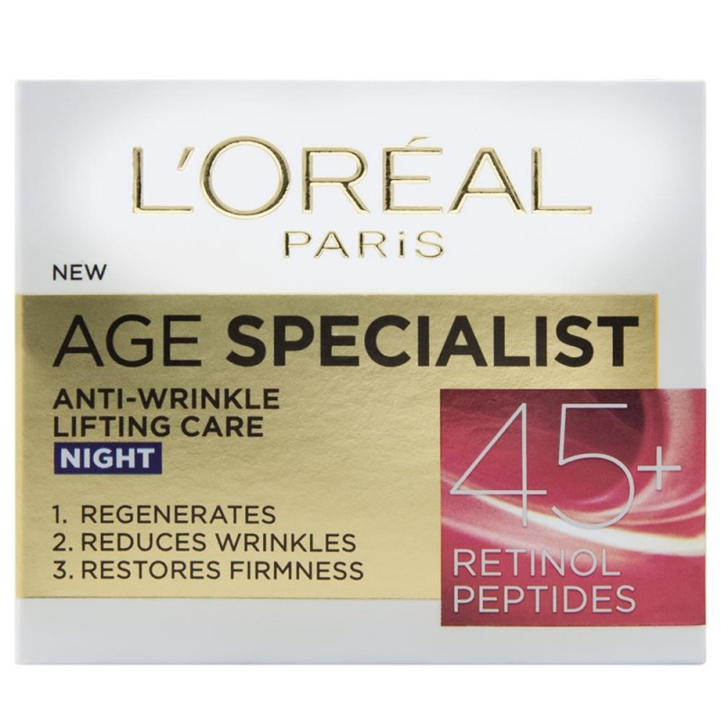 L'Oreal Paris Age Specialist Anti-Wrinkle 45+ egy bőrregeneráló éjszakai krém, amely a 45 év feletti bőr számára készült, amikor az kezd elveszíteni rugalmasságát és feszességét. Alvás közben a bőr a természetes regenerációs folyamaton megy keresztül, és ez a formula úgy lett kifejlesztve, hogy ösztönözze a helyreállítást és táplálását.