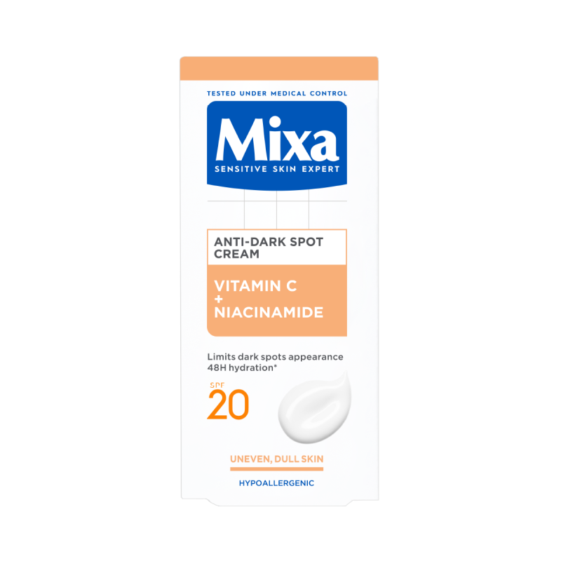 HATÓANYAGOK KOMBINÁCIÓJA: C-vitamin: a C-vitamin származéka, amely érzékeny bőrre alkalmas, és ismert a világosító hatásáról. Niacinamid: ismert arról, hogy csökkenti a sötét foltok megjelenését és egyenletesebb bőrszínt biztosít. KLÍNIKAILAG BEVIZSGÁLT EREDMÉNYEK. Azonnal: a bőrszín egyenletesebbnek tűnik. Hidratálás 48 órán keresztül*. 4 hét után: csökkenti a sötét foltok láthatóságát**. Napi fluid napvédő faktorral SPF 20. Könnyű, frissítő állag, fehér nyomok nélkül a bőrön. HASZNÁLATI ÚTMUTATÓ: Vigye fel az arc és a nyak bőrére tisztítás és szérum felvitele után. Kerülje a szemmel való érintkezést. Intenzív napfénynek való kitettség esetén használjon megfelelő napvédő krémet. Pumpás csomagolás, amely megvédi a formulát a levegővel való érintkezéstől. MIXA GARANCIA ÉRZÉKENY BŐRRE: ORVOSI FELÜGYELET ALATT TESZTELT. BEVIZSGÁLT HATÉKONYSÁG. HIPOALLERGEN FORMULA. 100% ÉRZÉKENY BŐRÖN TESZTELT. *Mérési teszt, 24 résztvevő 48 órán keresztül. **Klinikai teszt, 40 fő.