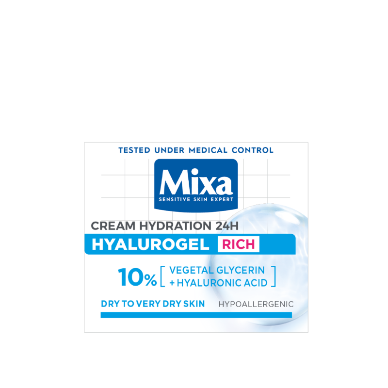 Hidratáló ápolás, tiszta hialuronsavval gazdagítva, amely a bőr természetes összetevője. Mixa Hyalurogel Rich 24 órán át hidratálja a bőrt és megőrzi a nedvességet az epidermiszben. Az egyedülállóan frissítő krémes textúra gyorsan felszívódik, hidratálja a bőrt és tartósan kellemes érzést hagy maga után. A formula 10% glicerin tartalmaz, és hialuronsavval van gazdagítva. A toleranciát érzékeny bőrön tesztelték. KOMEDOGÉNMENTES TERMÉK. Eredmények: A bőr intenzíven táplált és megnyugtatott, kényelmes érzést biztosít. Látványosan simább és feszesebb, a bőr ragyog és egészséges megjelenésű. Használati útmutató: Óvatosan tisztítsa meg érzékeny bőrét. Reggel és este vigye fel az arcra és a nyakra. Finoman masszírozza körkörös mozdulatokkal.